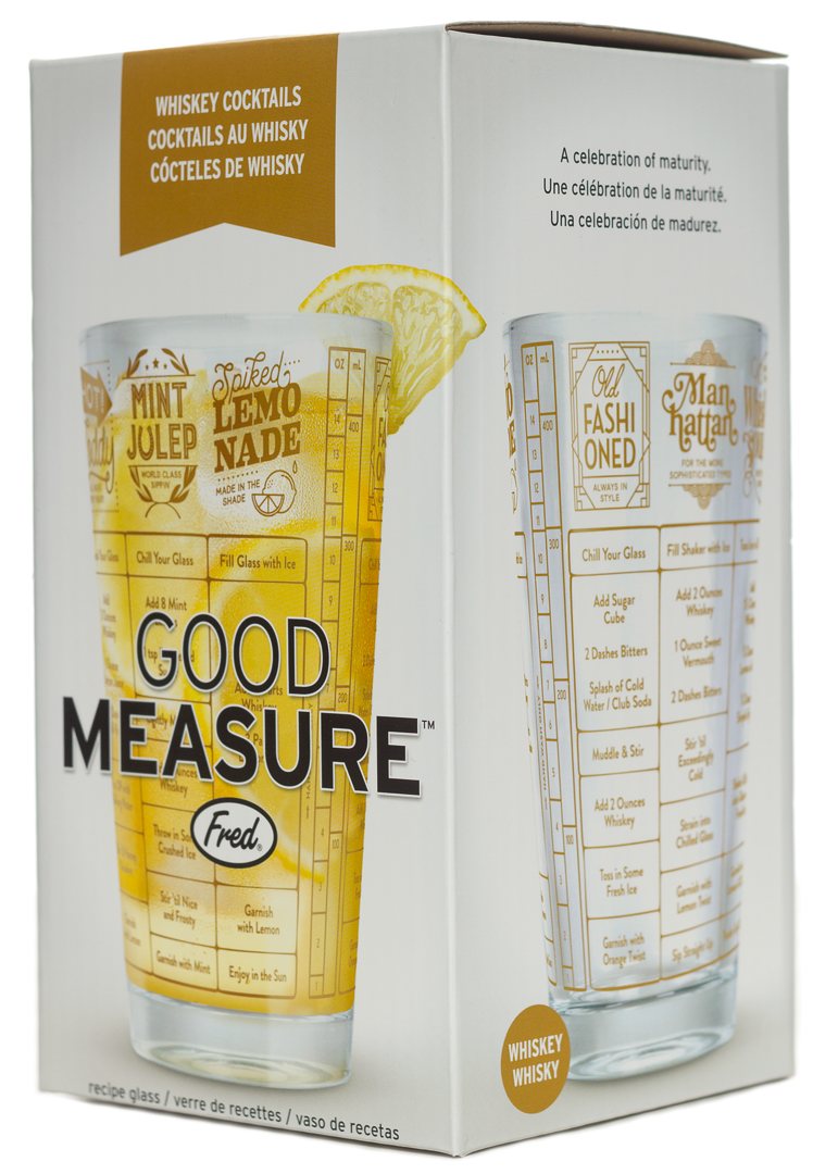 Mix it up with GOOD MEASURE! This 16 ounce measuring glass is printed with seven delectable cocktail recipes that are sure to turn you into the most-exacting mixologist. Hand wash only. Cheers!