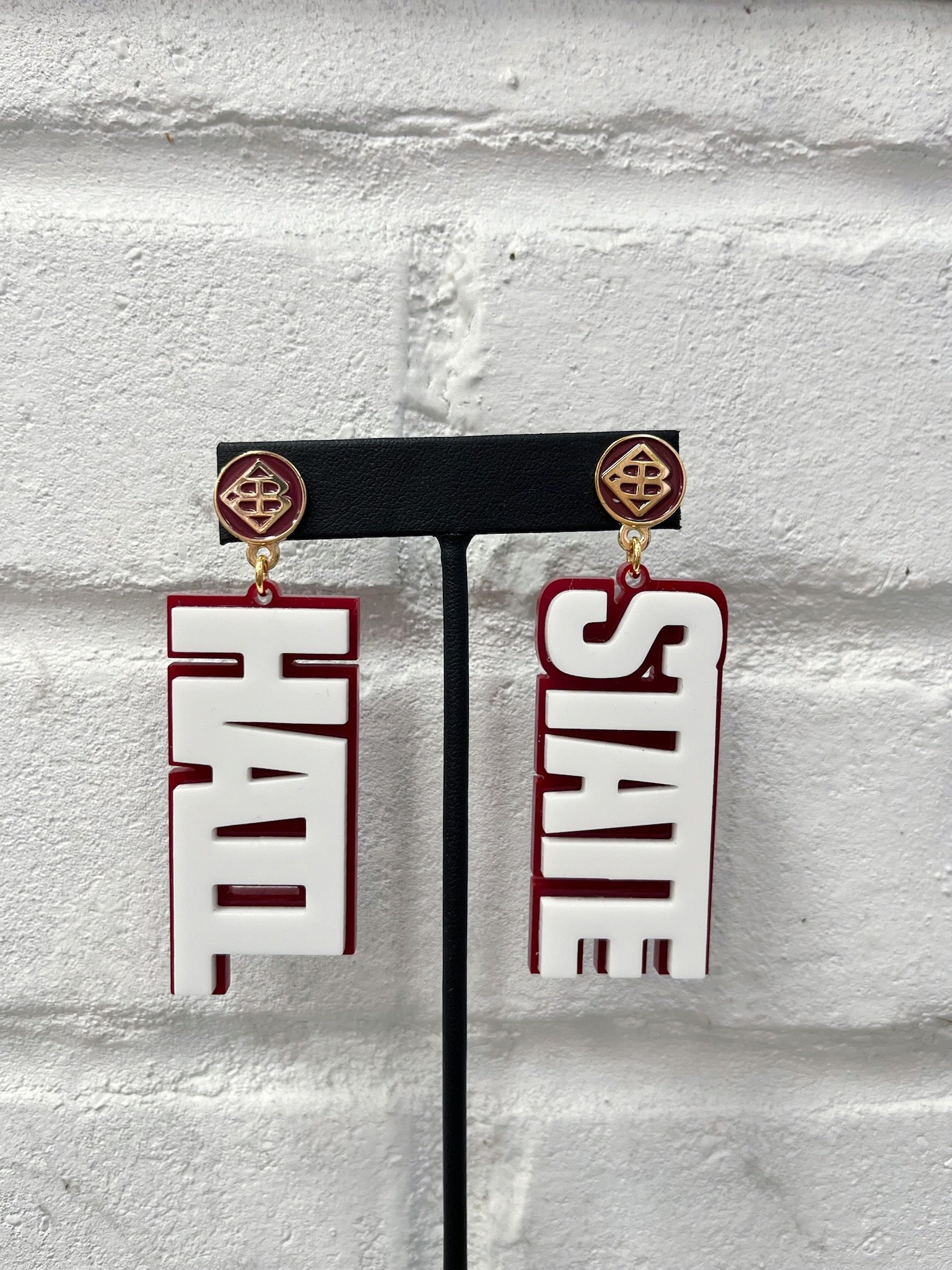 Be the envy of your friends with these Hail State statement earrings! Crafted with Maroon, White and Gold, these classy earrings will add the perfect finishing touch to any outfit. Hail State!