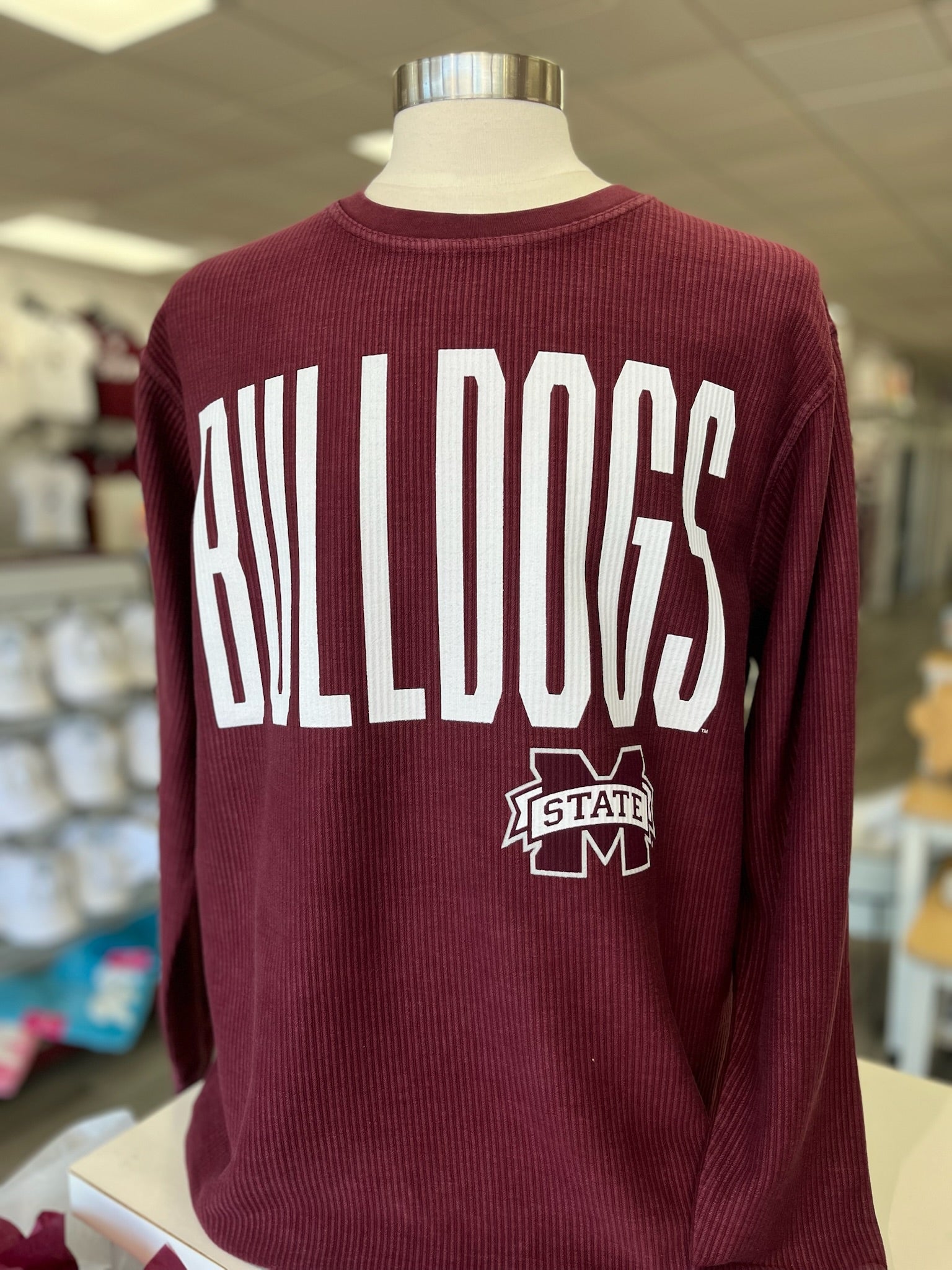 Stay cozy and stylish with the Mississippi State "Peterson" Corded Crew Neck sweatshirt. Its rich maroon hue and textured corded material add a unique twist to your casual wardrobe. The classic crew neck ensures comfort, making it your go-to for game days or weekend chill sessions. Perfect for showing off your Bulldog pride with a playful touch of warmth!