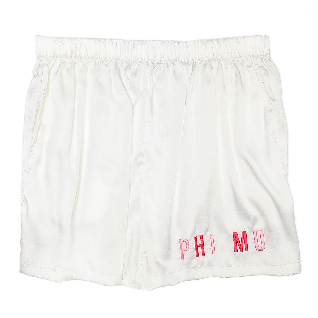White satin is embroidered with your sorority name in your colors completed with a comfy elastic waist band and pockets.